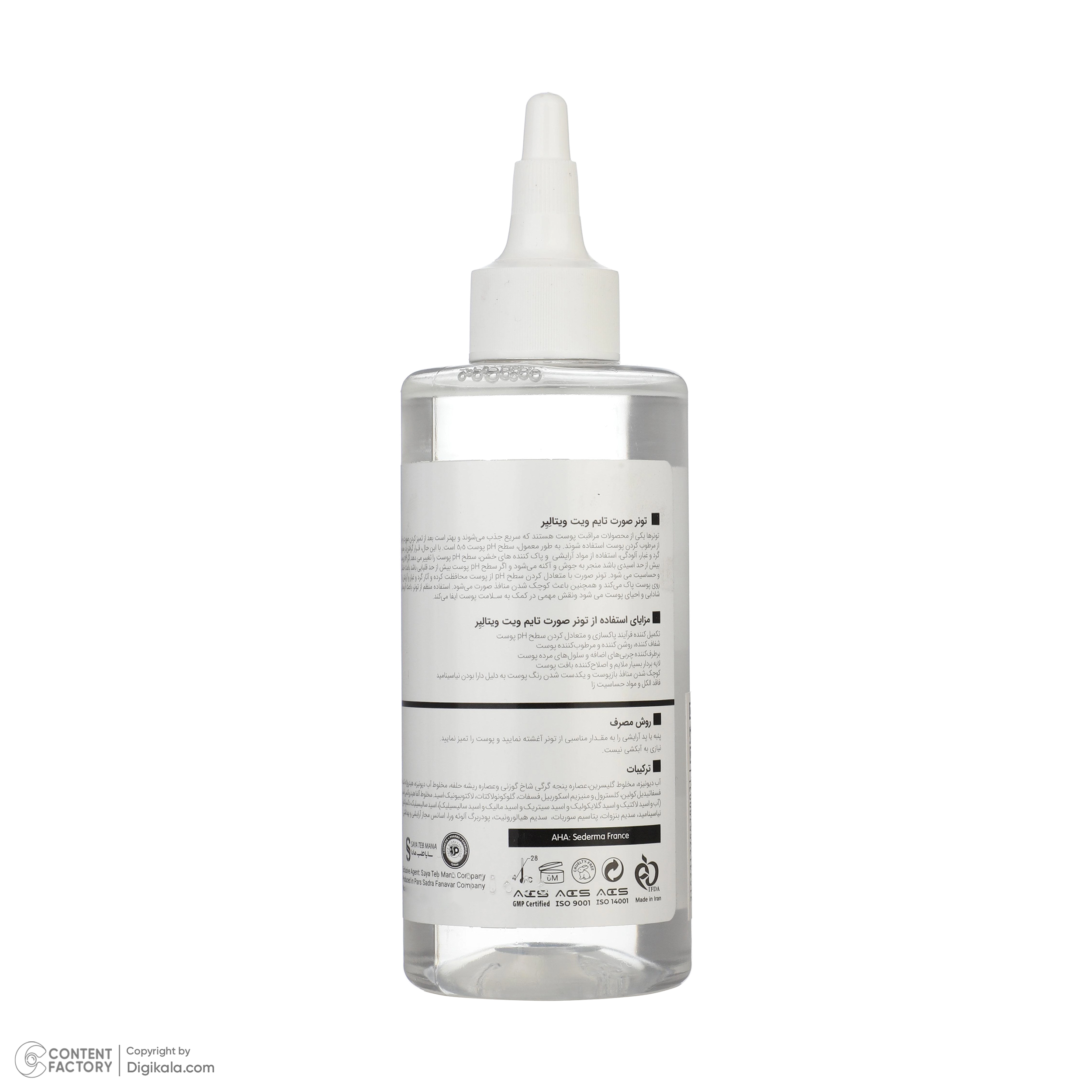 تونر ویتالیر مدل تایم ویت، دارای ویژگی های منحصر به فردی است که به سلامت و زیبایی پوست شما کمک میکند. این تونر با ترکیبات طبیعی و موثر، به پاک کردن و مرطوب کردن پوست کمک میکند. تونر ویتالیر مدل تایم ویت، مرطوب کننده، لایه بردار و کوچک کننده منافذ باز پوست است. این تونر همچنین روشن کننده است و به بهبود رنگ پوست کمک میکند. برای استفاده از این تونر، پنبه یا پد آرایشی را به مقدار مناسبی تونر آغشته کنید و پوست را تمیز کنید. نیاز به آبکشی ندارد. تونر ویتالیر مدل تایم ویت، مناسب برای انواع پوست است و یک گزینه ایدهآل برای کسانی است که به دنبال یک محصول مراقبت از پوست هستند که بتواند به سلامت و زیبایی پوست آنها کمک کند.